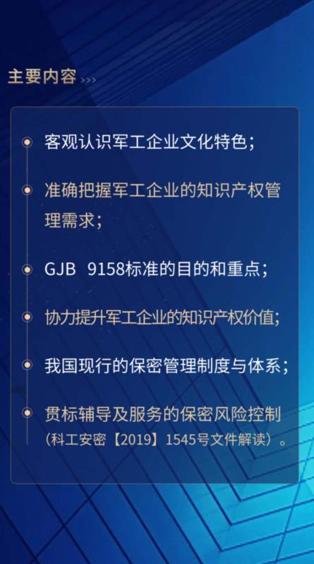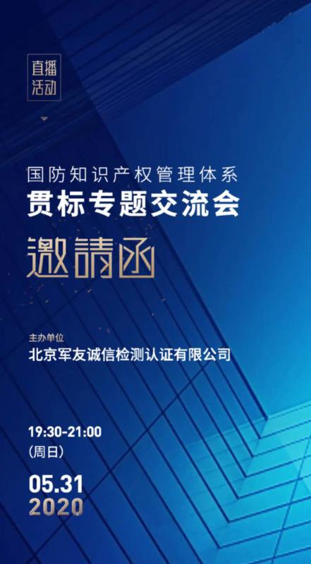 2020年5月31日19:30-21:00,北京軍友誠信檢測認證有限公司將舉辦第一期國防知識產權管理體系貫標專題交流會,誠摯邀請廣大客戶朋友觀看直播。直播結束時安排抽獎環(huán)節(jié),將贈送《國防科技工業(yè)知識產權工作200問》10本。