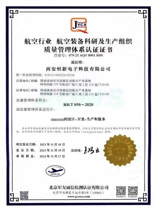 2021年11月18日,北京軍友誠信檢測認(rèn)證有限公司(以下簡稱軍友誠信)為西安恒新電子科技有限公司頒發(fā)首張RB/T 050-2020《航空行業(yè) 航空裝備科研及生產(chǎn)組織質(zhì)量管理體系 要求》認(rèn)證證書。