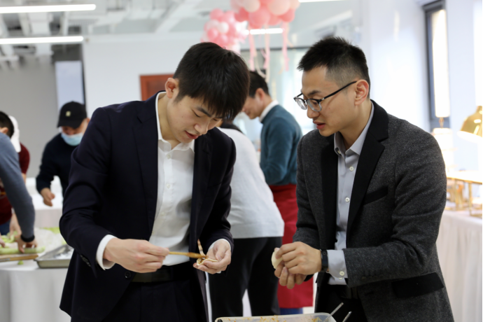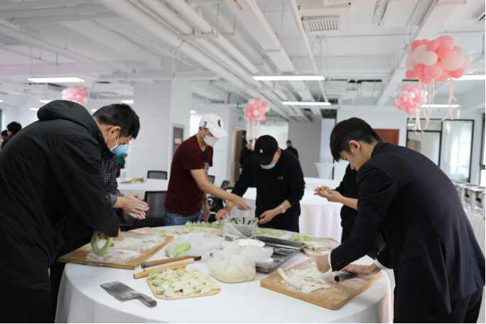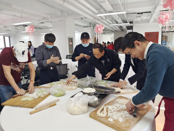 在活動(dòng)現(xiàn)場(chǎng)公司男同志們主動(dòng)走進(jìn)廚房,紛紛大顯身手,親自掌廚,展示自己的精湛廚藝,大家圍在一起有人和面、有人搟餃子皮、有人添餡捏邊,每一個(gè)步驟,每一個(gè)動(dòng)作,都透露著對(duì)女職工的祝福,歡樂(lè)的氛圍充斥著整個(gè)大廳。
