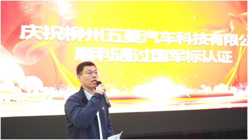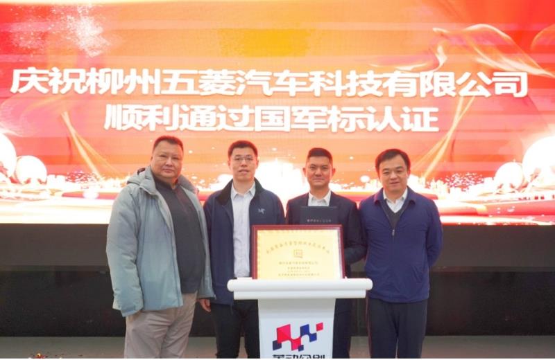2024年3月4日,柳州五菱汽車科技有限公司(以下簡稱五菱科技)舉辦了武器裝備質(zhì)量管理體系認(rèn)證證書授牌儀式。北京軍友誠信檢測認(rèn)證有限公司(以下簡稱軍友誠信)周濤總經(jīng)理、謝志磊副總經(jīng)理,廣西汽車集團(tuán)有限公司陳曉峰副總裁,柳州五菱汽車科技有限公司田留勝總經(jīng)理、廖睿副總經(jīng)理出席會(huì)議。軍友誠信周濤總經(jīng)理為五菱科技頒發(fā)了武器裝備質(zhì)量管理體系認(rèn)證證書和銅牌