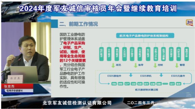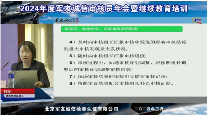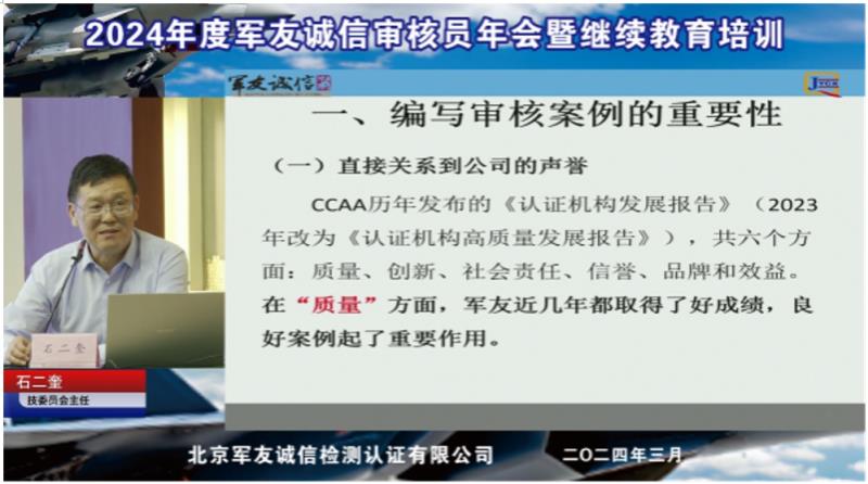 會議邀請到了原國防科工委科技與質(zhì)量司司長高志強(qiáng),就國防科技工業(yè)發(fā)展情況作了介紹。會議還邀請軟件專家陳竹梅老師講授了《計算機(jī)軟件質(zhì)量管理體系審核要點(diǎn)》。為了提升專業(yè)技術(shù)水平,技術(shù)委員會主任兼管理者代表石二奎作《審核案例編制說明》講解,質(zhì)量保證部部長王淘就《2023年雙隨機(jī)一公開檢查工作情況通報》及《審核相關(guān)問題》為題作了講解。為了進(jìn)一步擴(kuò)大及鞏固市場,信用評價部部長張京燾作靜電防護(hù)業(yè)務(wù)情況介紹,市場部部長喬琦就目前市場形勢及發(fā)展情況作了介紹。為了進(jìn)一步提升人員管理效率,體系管理部部長劉婷宣講了《審核員管理規(guī)范及要求》的內(nèi)容。培訓(xùn)結(jié)束后,組織了線上考試。