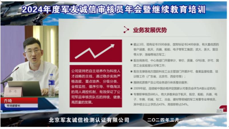 報告中,系統(tǒng)分析了軍品認(rèn)證的形勢和發(fā)展趨勢,深度挖掘了公司面臨的挑戰(zhàn)和機(jī)遇,重點(diǎn)指出,2024年軍友誠信要以更實舉措、更優(yōu)服務(wù)做強(qiáng)主業(yè),在總體“穩(wěn)”的基礎(chǔ)上,牢牢把握新時代管理體系認(rèn)證、實驗室認(rèn)可和檢測工作的新方向、新要求,拓展新業(yè)務(wù)模式,抓改革、促質(zhì)量、強(qiáng)內(nèi)功、創(chuàng)品牌,確保公司實現(xiàn)可持續(xù)發(fā)展。