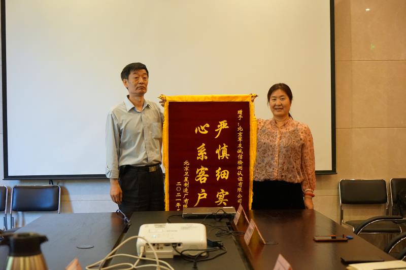 5月28日,北京衛(wèi)星制造廠有限公司(簡稱衛(wèi)星制造廠)總質(zhì)量師陸永平一行3人,將一面寫有“嚴慎細實 心系客戶”的錦旗送到了北京軍友誠信檢測認證有限公司(簡稱軍友誠信),對軍友誠信真誠幫助企業(yè)解決實際問題以及高效優(yōu)質(zhì)的服務(wù)表示感謝,并與軍友誠信總經(jīng)理王巧云、技委會主任石二奎、總經(jīng)理助理張皛等相關(guān)工作人員進行了座談。